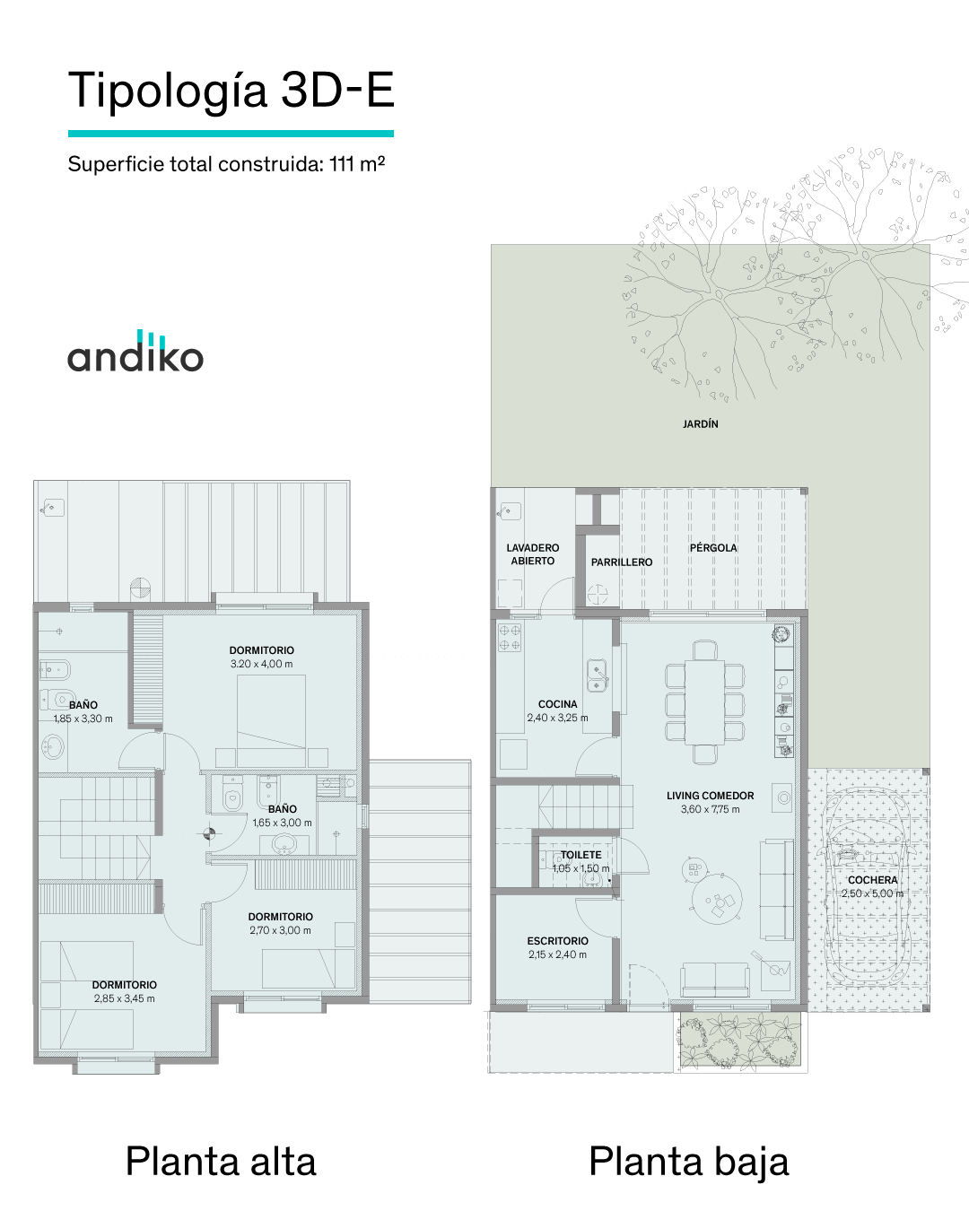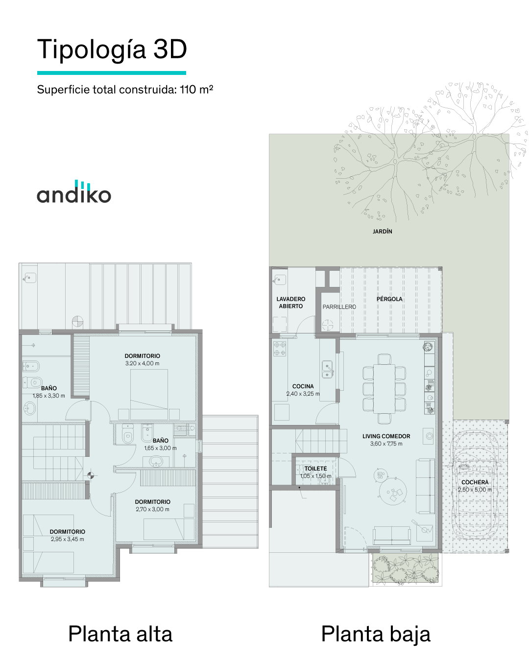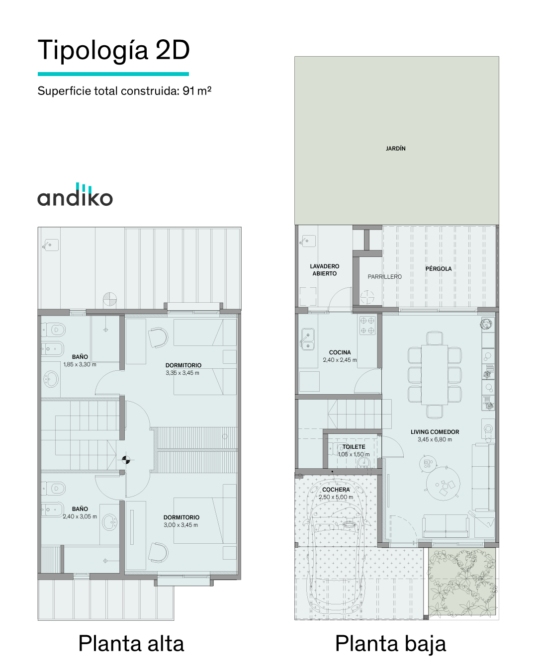 Leer más >Su diseño está pensado para maximizar la privacidad y favorecer la iluminación natural. En Andiko la seguridad es una prioridad: videovigilancia integral y portería 24 horas. Cada unidad cuenta con estar-comedor amplio, cocina integrada con lavadero, toilette y cochera techada en planta baja. En planta alta se ubican los dormitorios —todos en suite en las unidades de 2 dormitorios, y con suite principal en las de 3— con techos de 2,60 m libres que le dan una amplitud poco común en el mercado. Jardín de uso exclusivo y terraza con parrillero y pérgola completan cada unidad. La Etapa 4, actualmente en construcción, suma las últimas 18 unidades con entrega prevista para fines de junio de 2026. Comodidades: 2 dormitorios (91 m²) · 3 dormitorios (103,6 m²) · 3 dormitorios + escritorio (115,3 m²) · jardín privado · terraza con parrillero y pérgola · cochera techada · barrio cerrado con vigilancia 24 horas