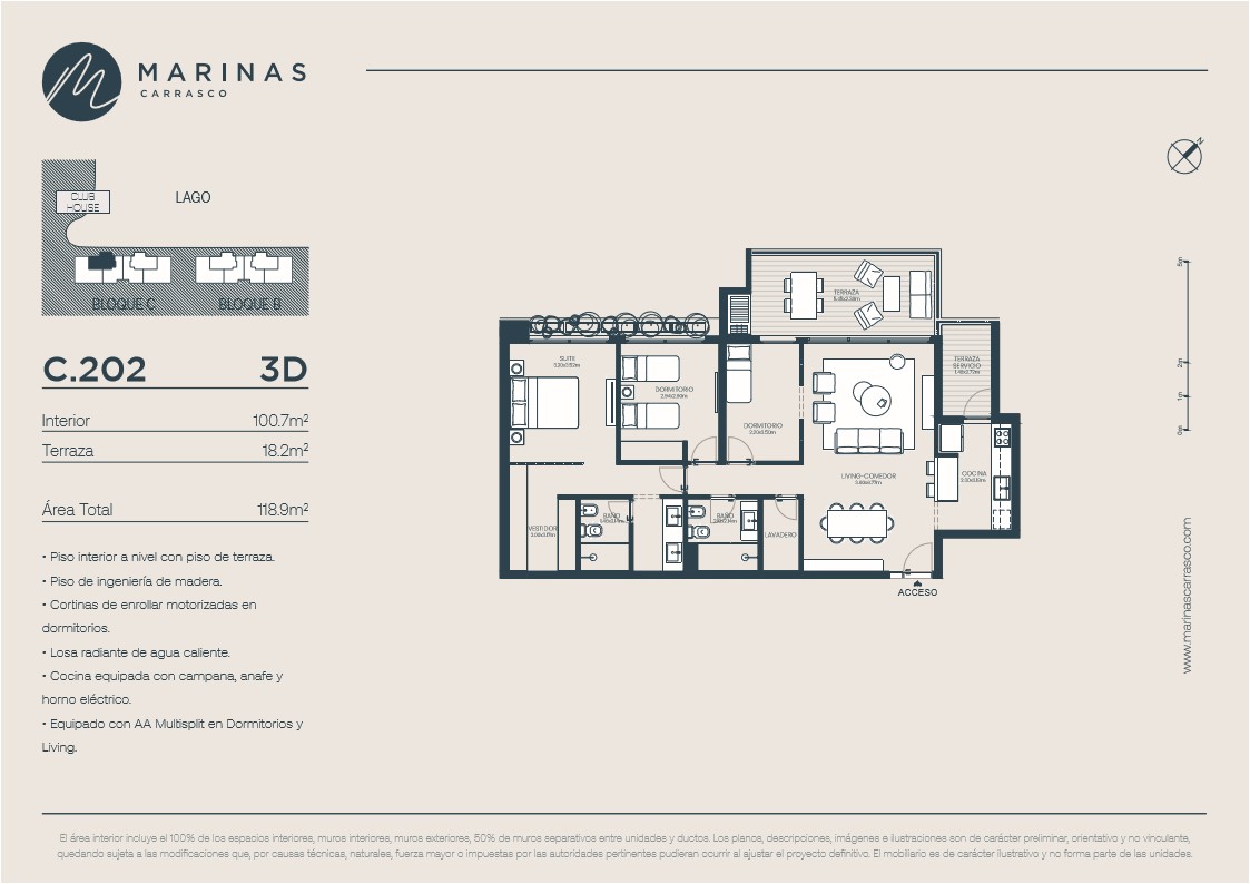 Leer más >Con orientación noroeste, todos los apartamentos cuentan con terrazas, parrillas y vista al lago, además de un diseño de alta calidad del Estudio Gómez Platero. Marinas Carrasco tendrá su ingreso principal conectado a dos accesos, uno que será por la calle lateral a Avenida de las Américas (al norte de Avenida Italia), y otro desde el corazón de Parque Miramar, lo que hará muy práctico tanto el ingreso como la salida al barrio.