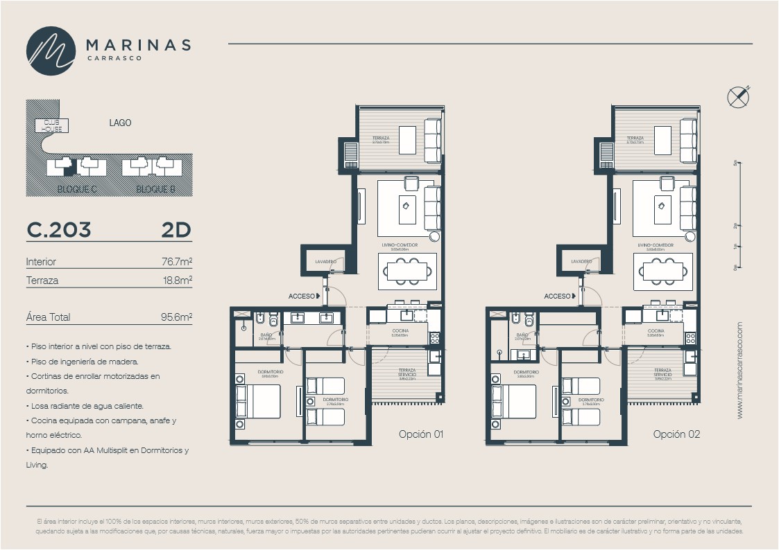 En Marinas Carrasco se destaca con la combinación ideal, uniendo un entorno natural único con una propuesta constructiva de alta calidad y diseño. El proyecto está ubicado en la intersección de Avenida Italia y Avenida de las Américas, junto al lago de Parque Miramar, y comprende una zona total de cuatro hectáreas. En «un lugar perfecto», que permite la desconexión del bullicio de la ciudad, pero a la vez brinda la tranquilidad de estar a cinco minutos de colegios y servicios, tener rápido acceso a las avenidas, rápida llegada al Aeropuerto Internacional de Carrasco y una práctica salida hacia el este del país. Cuenta con dos fases de urbanización, una con casas y otra con dos bloques bajos de apartamentos residenciales (edificios de seis pisos de altura y 36 unidades de vivienda en cada uno, con apartamentos de entre 75 y 125 m2 (2, 3 y 4 dormitorios), además de un club house sobre el lago.